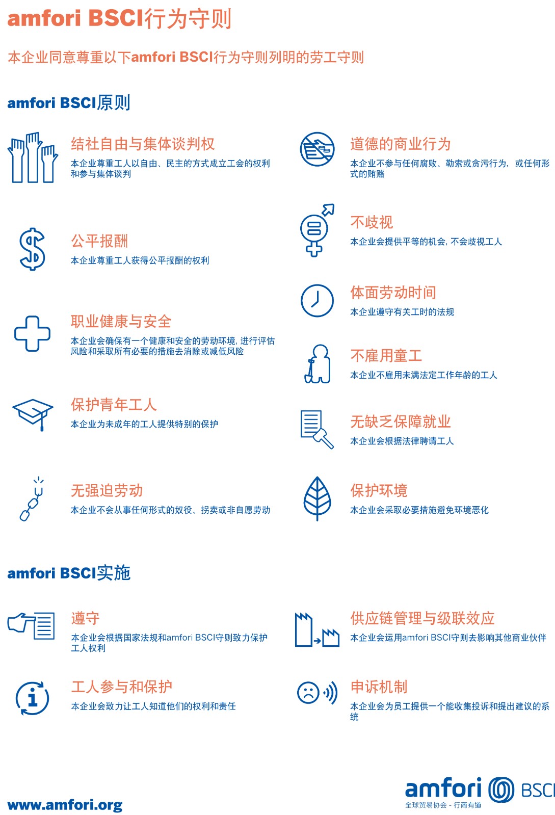 BSCI (Business Social Conduct Initiative) aims to implement a unified set of procedures to monitor and promote the social responsibility performance of companies producing related products through continuous improvement and development of policies. Many European brands and retailers, including C&A, Coop, Esprit, Metro Group, and OBI, recognize BSCI certification.